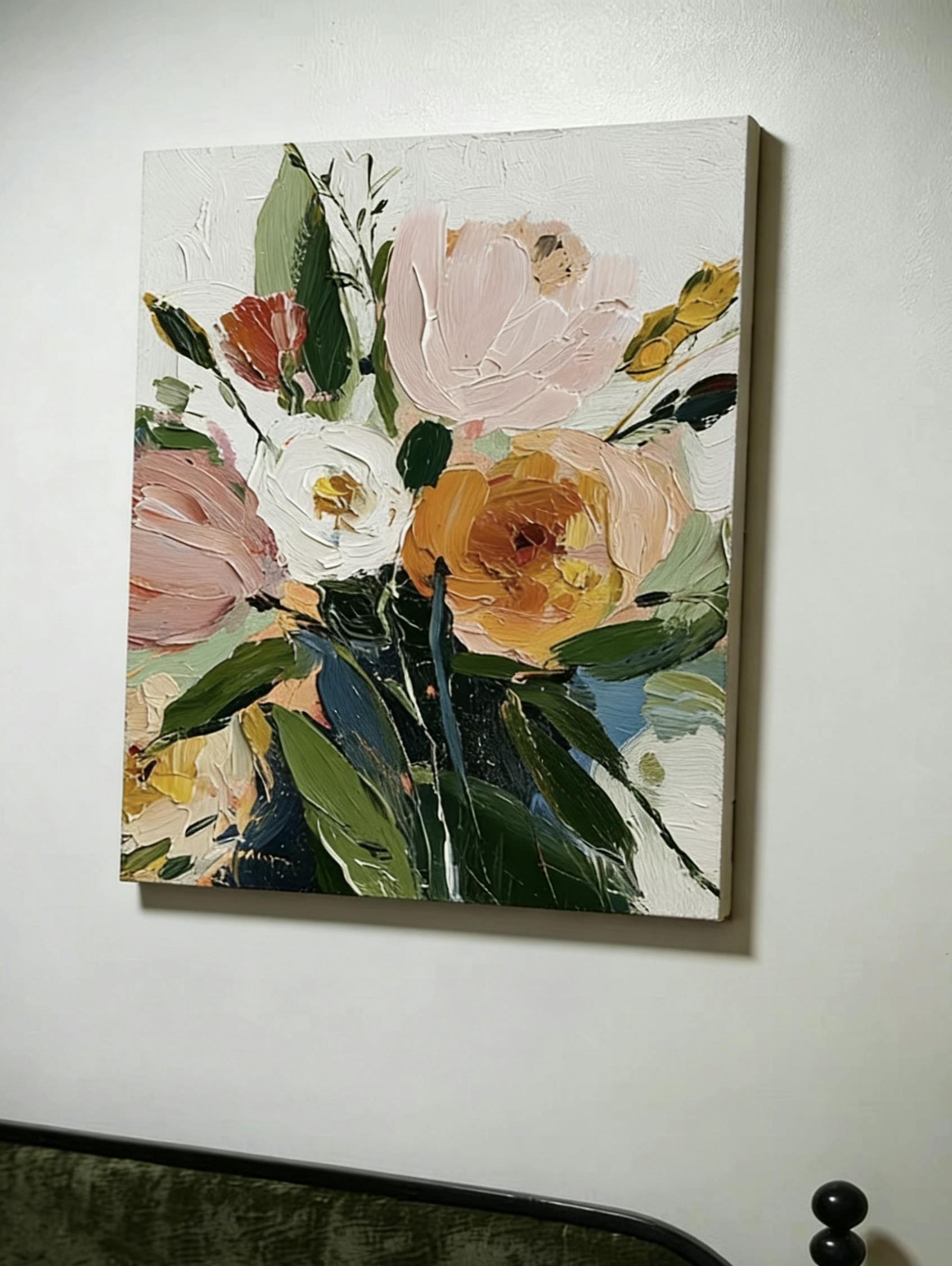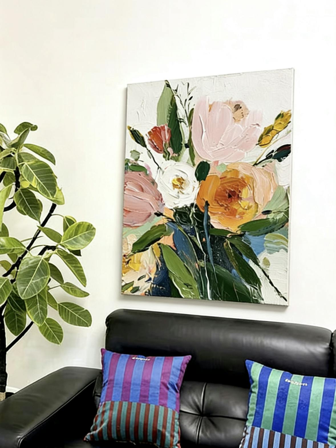 Hand-painted in oil with deliberate, textured strokes, each petal and leaf is built to catch light and cast shadow, creating a surface that is both visually rich and emotionally resonant. The palette—a chorus of pinks, corals, yellows, and soft greens—speaks of vitality and tenderness, inviting the viewer to look closer and perhaps see their own daily life with renewed affection.